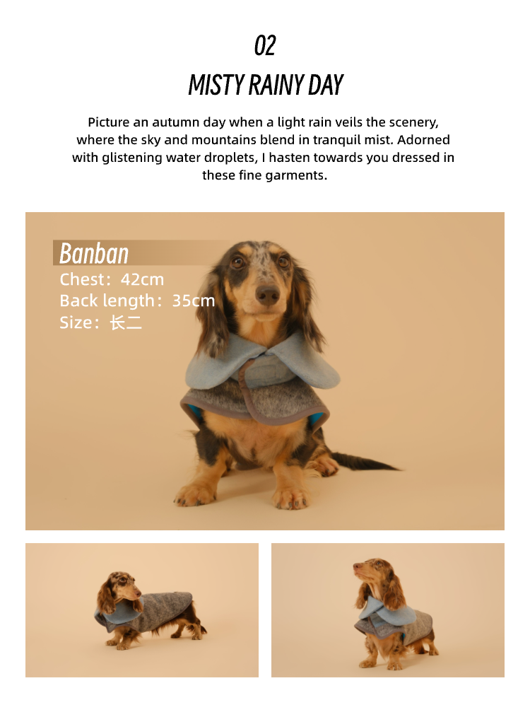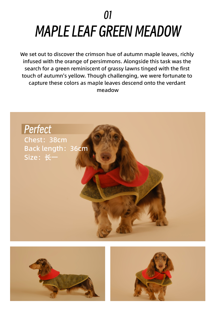 Presenting a luxurious woolen cape coat exclusively designed for Dachshunds. This versatile piece is easy to put on and take off, making it suitable for indoor and outdoor activities within the city.